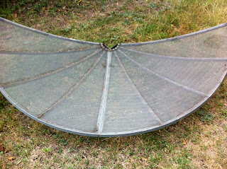 Once I'd done that I had to clean the darned thing pretty well, because it's been sitting in my dad's backyard for about ten years. Then I had some repairs to do. The dish is really light weight aluminum, and as such, having been in the same place for so long, some of the mesh was torn from wind damage, and saplings growing up through my dad's garbage heap and into the wire mesh. So I took a hammer and dolly and beat that sucker into submission, until the shape was right. To strengthen the places where it was torn, I took some thin wire and some needle nose pliers, and "sewed" the mesh back together.