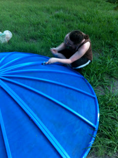 I had bought a 10 ft. pole to mount it on, and had an 18 inch pole that fit just around it, by some amazing coincidence. The 18 inch pole was found in the depths of my dad's workshop. I don't know where it came from. The 10 ft. pole was just a galvanized steel pole threaded at the end. Now, I wanted the lip of the umbrella to be just tall enough for any reasonable ***** type person to be able to walk under comfortably, without being tall enough to be seen by the code enforcement officers from the street. I checked to see if there were any codes against patio umbrellas, and there weren't, but I'm sure they would find some fault with it. So I used my fancy shmancy edumacation to conclude we needed to chop off about a foot and a half. Not every girl is lucky enough to have a hacksaw of her very own. Then we pounded the shorter pole into the ground where we wanted it, took it out, removed the dirt, and pounded it back in. Threaded the newly resized pole onto the flange, and slid the tall pole with the new umbrella into the void in the ground created by the smaller pole.